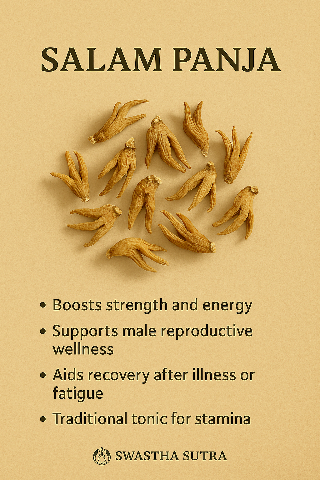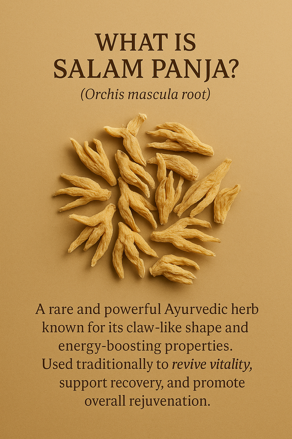 Salam Panja is one of Ayurveda’s rarest herbs, sourced from the high-altitude forests of the Himalayas. Traditionally used in formulations for male vitality, energy recovery, and post-illness nourishment, it is known to balance Vata and strengthen the nervous and reproductive systems.